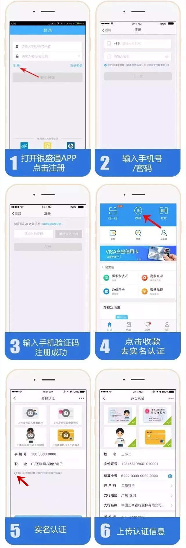 进 银盛通 app, 点左上角 扫一扫 扫盒子边长长的条形码,或是扫机子背面长长的条形码,然后按提示上传 身份证 ,银行卡,人脸识别